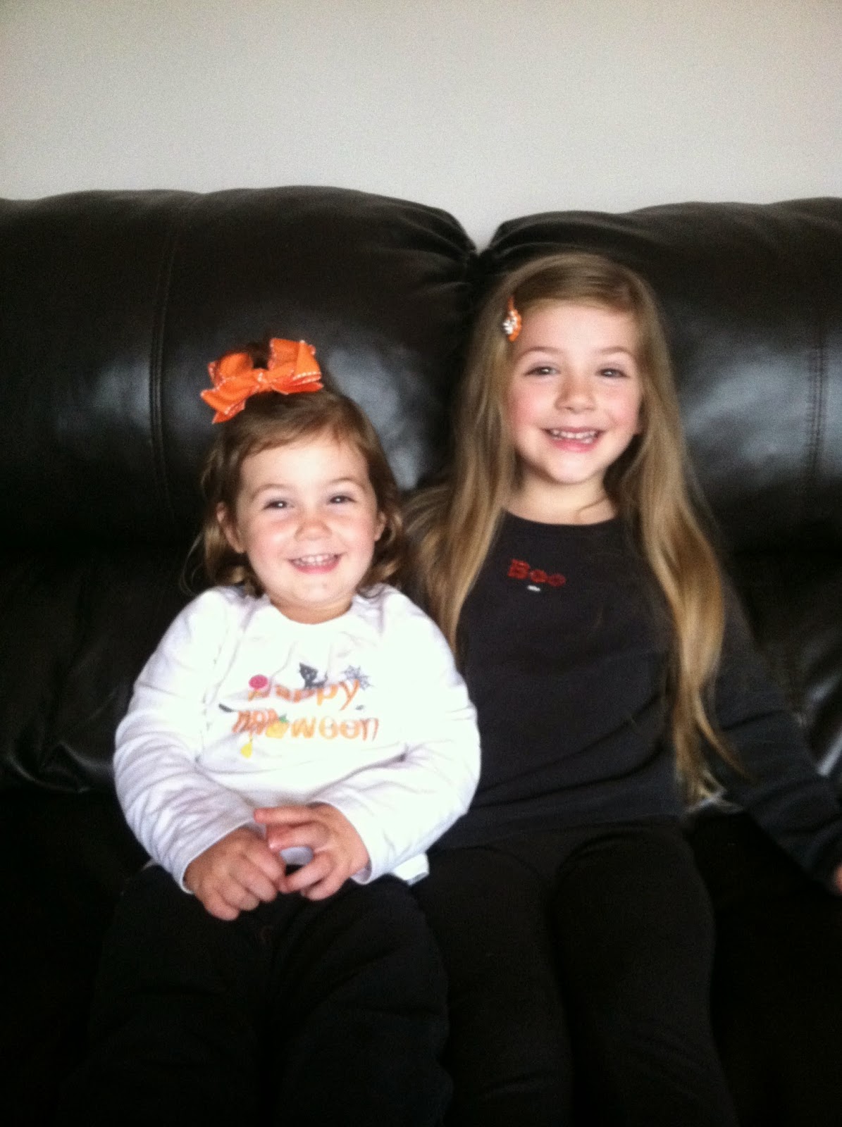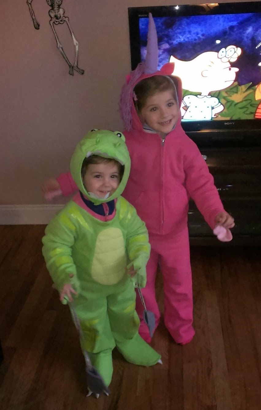 According to tradition, on Halloween my mom and dad came over before trick or treating and brought us dinner (I REALLY like that tradition), then the girls got dressed and practiced trick or treating with the treats my mom and dad brought them. Genevieve still didn't want to be Mickey, for unknown reasons, but thankfully she chose a dinosaur costume that could fit lots of layers underneath.